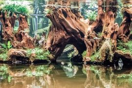 This would give the depth of the cube tank versus its width-a perfect dream for painting any aquascapist’s ultimate dream of scale and depth in the aquascape. It would be like working with a 3D canvas where you’re trying to paint not just width but also height and depth. One of my earlier projects working with a 20-gallon cube was a project I titled “Forest Retreat.” I remember looking at the blank canvas presented by the empty cube and immediately imagining a dense, mystical forest. I wanted it to bring the feel of a woodland clearing, with towering driftwood acting as trees, and lush carpeting plants filling the forest floor.